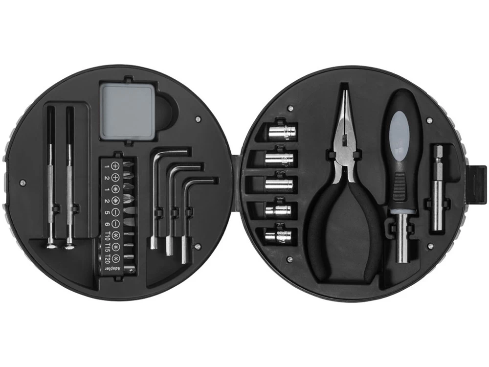Набор из 25 инструментов включает измерительную мини рулетку, крестообразную отвертку, плоскую отвертку, 9 насадок с адаптером 4 крестообразных шлицев, 2 плоских шлица и 3 шестигранных шлица , 3 шестигранных ключа, 5 головок 5-9 мм , острогубцы, рукоятку отвертки, адаптер для насадок и удобный футляр.